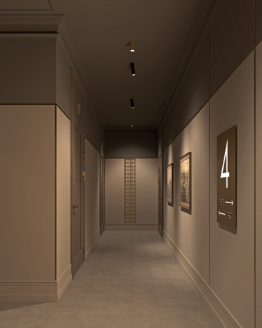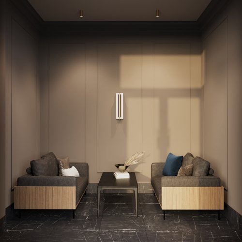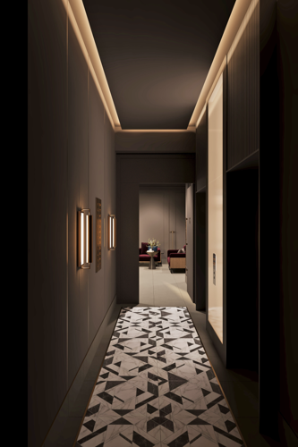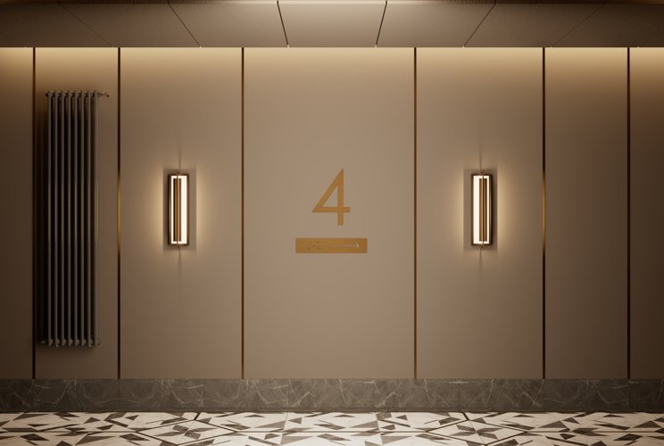 Оформление жилых пространств также выполнено с безупречным вкусом: мягкий тёплый свет создаёт атмосферу уюта, парящие потолки добавляют ощущение простора, а латунные акценты придают интерьеру благородство. Авторские двери с деревянным покрытием и качественной фурнитурой подчёркивают статус и внимание к деталям. В холлах уложен европейский ковролин, обеспечивающий дополнительную шумоизоляцию и комфорт.