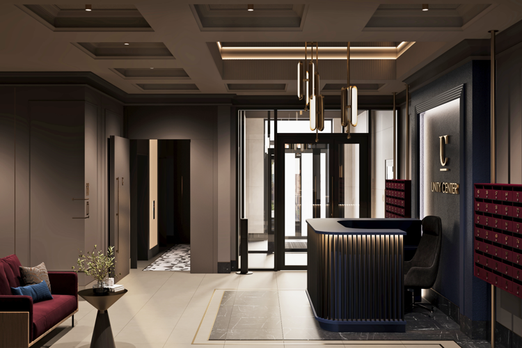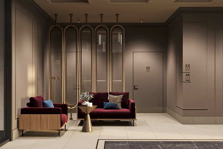 Центральная входная группа включает лобби с зоной ожидания и стойкой консьержа для жильцов и гостей в холле первого этажа.