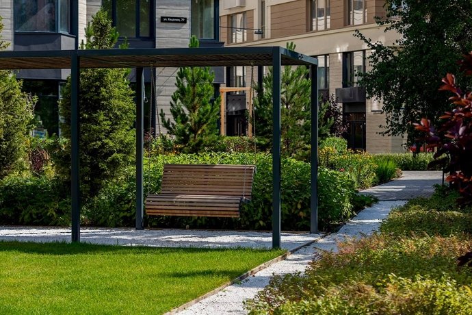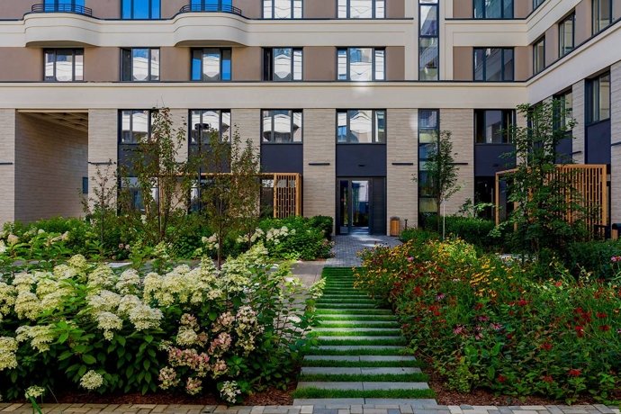 Пространство двора организовано как зелёный парк с прогулочными аллеями, зонами отдыха, современными детскими площадками и спортивными локациями.